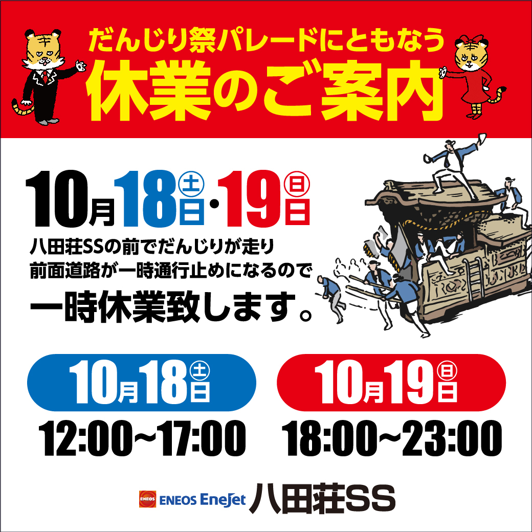 八田荘SSではだんじり祭りの為、下記の日時で一時休業いたします。