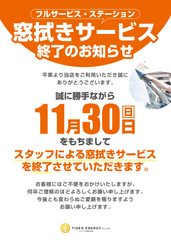 スタッフによる窓拭きサービスを終了させていただく事になりました。