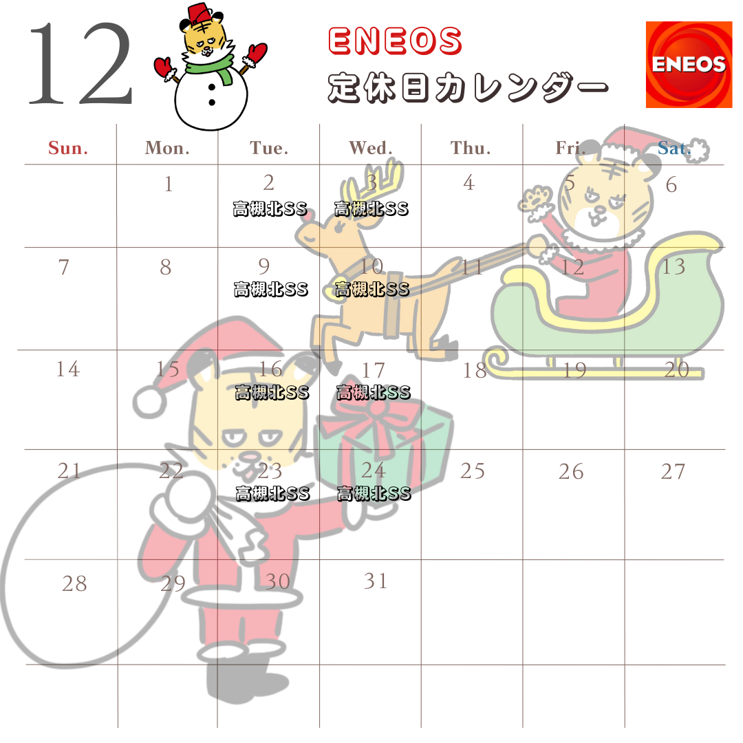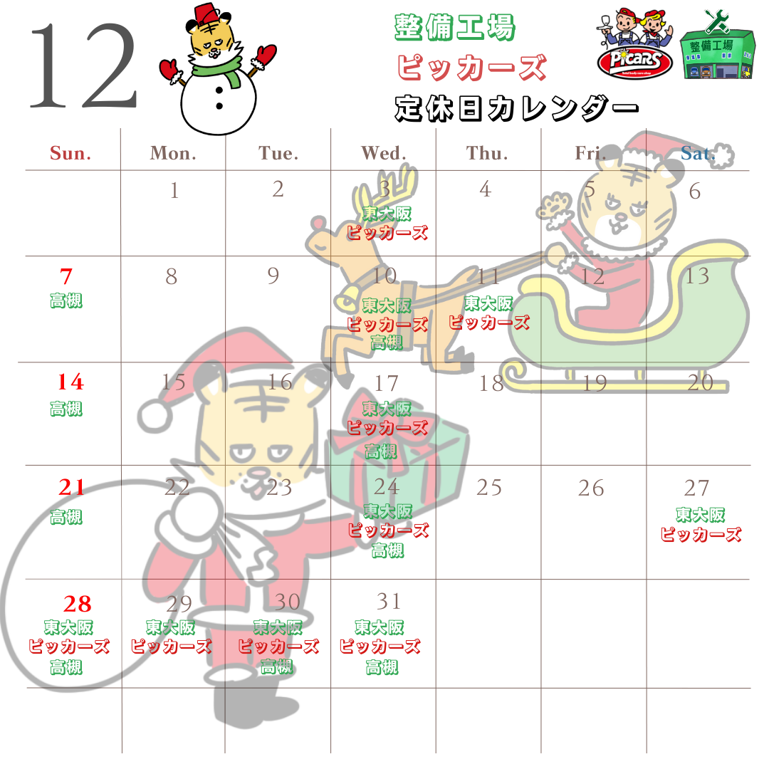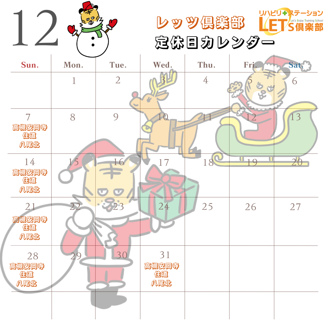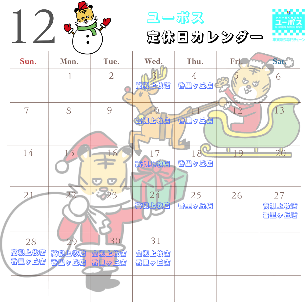 12月の各店舗の定休日のご案内です。