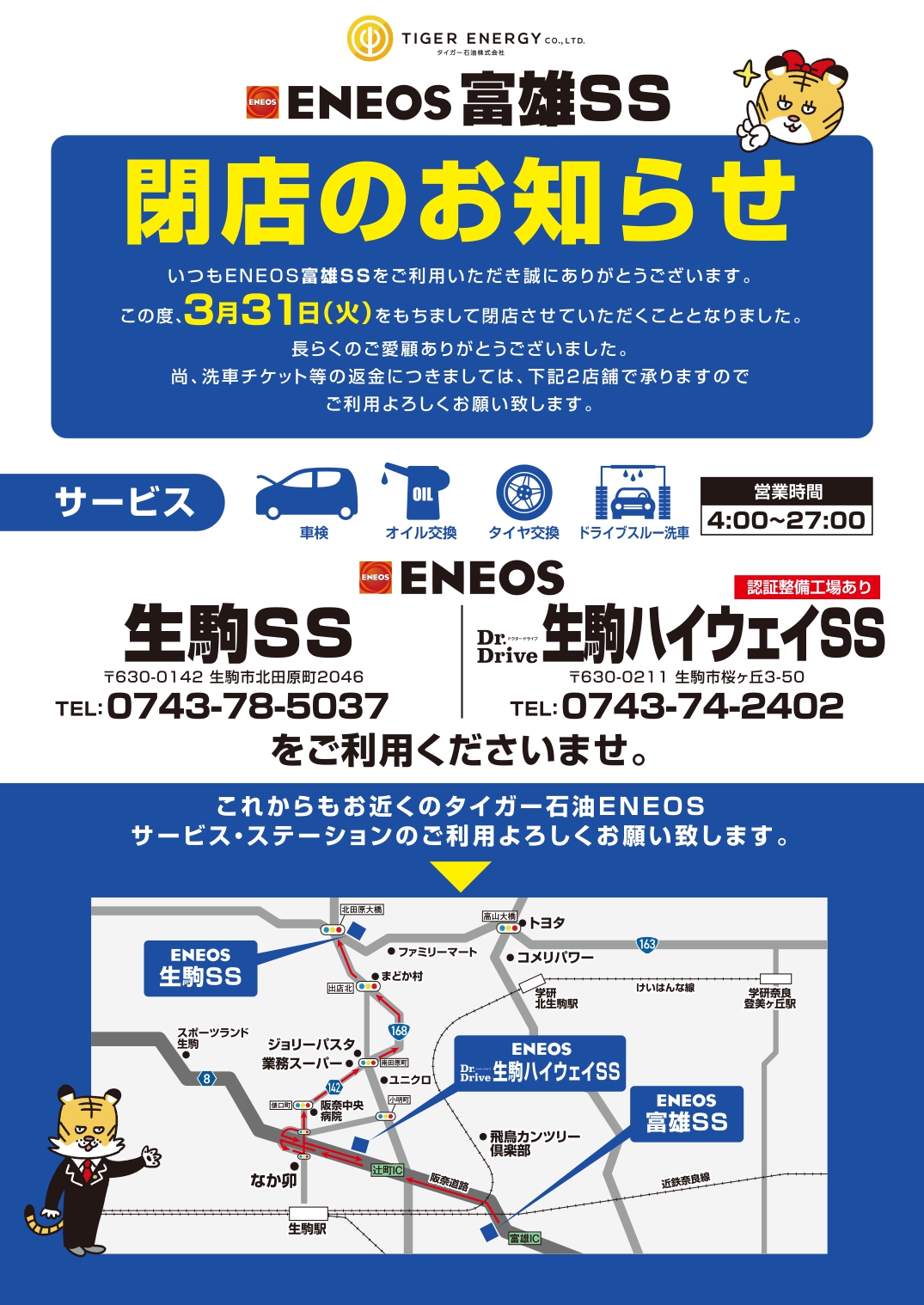、ご案内に記載の生駒SS並びに生駒ハイウェイSSにて承っておりますのでよろしくお願いいたします。