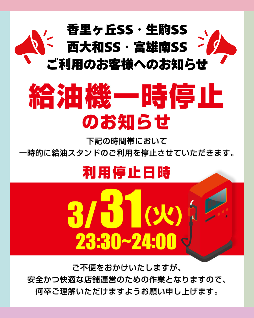 香里ヶ丘SS・生駒SS・西大和SS・富雄南SSでは下記日時において、設備点検の為、給油いただけません。