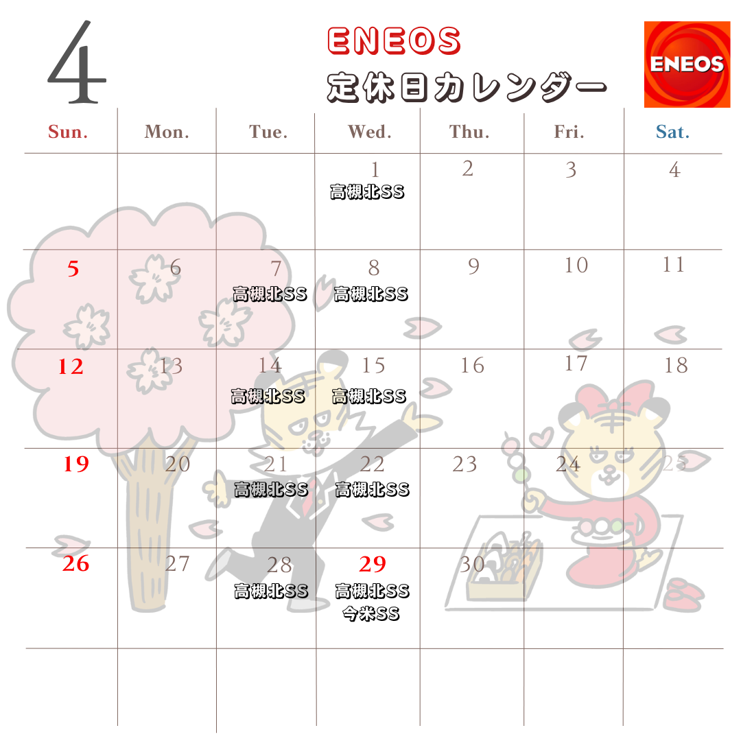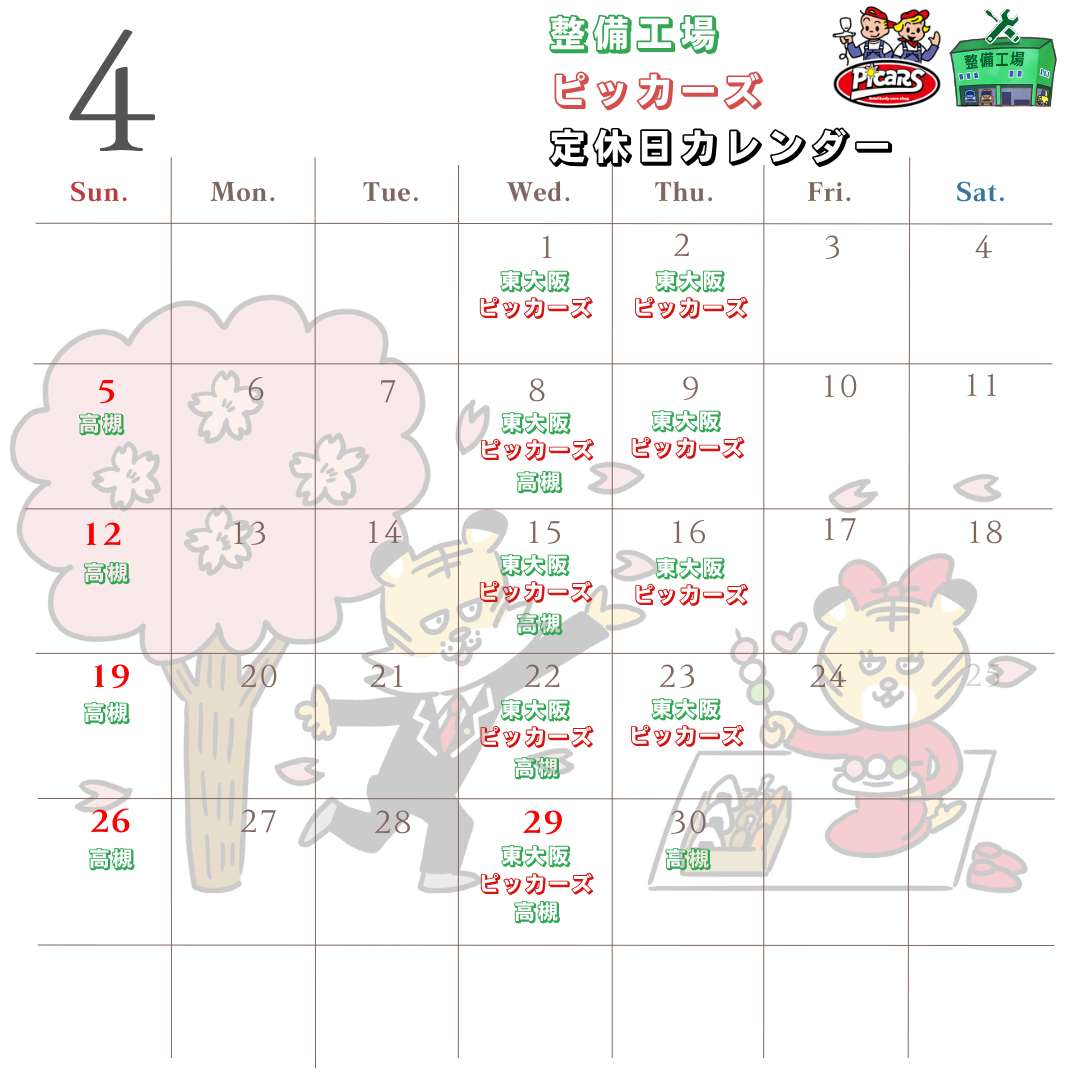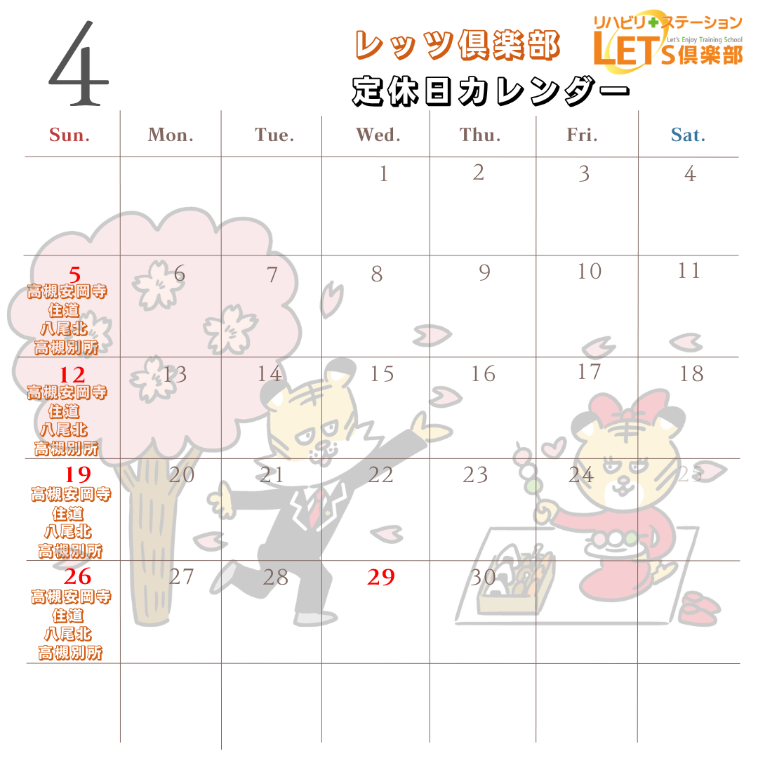 4月の各店舗の定休日のご案内です。